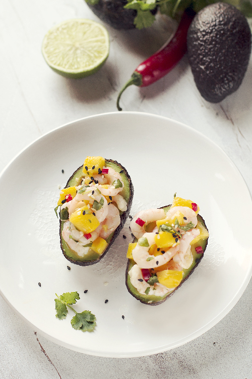 Obierz krewetki. Pokrój mango w kostkę, Pokrój na drobno chili i kolendrę. Wymieszaj wszystko z sezamowym olejem i sokiem z limonki. Dopraw solą. Przekrój awokado na pół, wydrąż pestkę i nadziej je marynowanymi krewetkami. Posyp sezamem.