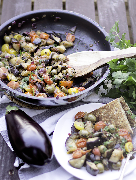 Pokrój bakłażana w dużą kostkę, posól i odstaw na godzinę. Odciśnij nadmiar płynu i usmaż na oliwie na złoty kolor. Pokrój cebulę w kostkę, czosnek w plasterki i zeszklij na oliwie. Dodaj oliwki bez pestek i kapary. Smaż przez minutę. Dodaj usmażonego bakłażana i pomidorki, przekrojone na pół. Dopraw solą, pieprzem, oregano i octem. Smaż przez jeszcze przez 5 minut. Na koniec dodaj natkę pietruszki i wymieszaj. Podaj na gorąco do chleba.