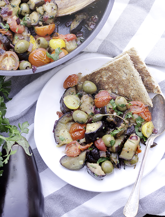 Bakłażan w pomidorach! Lubicie potrawy z bakłażana? Smażony bakłażan, słodkie pomidorki koktajlowe, oregano, oliwki i kapary…Po prostu poezja. Włoskie danie znane jako caponata, idealne do chleba. Tak przyrządzony bakłażan w pomidorach, na kolację podaję z lampką białego wina. Gorące i aromatyczne danie, idealne na zimowe wieczory!