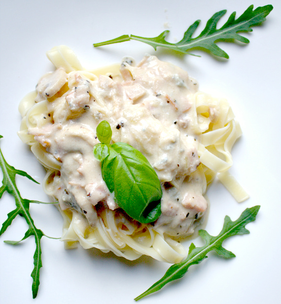 Niech was nie zwiedzą zielone dodatki na talerzu. Ten sos jest kaloryczną bombą, ale jak smakuje… Ja użyłam gorgonzola, ale robiłam ten sos z innymi serami pleśniowymi. Ponadto dodałam do sosu bardzo śmietankowy ser żółty, który jeszcze bardziej podkreślił serowy smak sosu. Sos na tym etapie jest już gotowy, jeśli nie masz ochoty na szynkę.