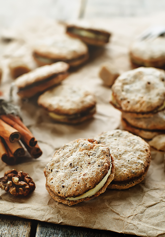 Zostały mi białka, więc upiekłam orzechowe bezowe ciastka orzechowe. Ciastka bezowe przełożyłam lekkim kremem z mascarpone. Robi je się szybko, a jeszcze szybciej znikają z talerza! Bezowe ciastka można przełożyć kremem. Przygotowałam prosty krem z mascarpone i białej czekolady.