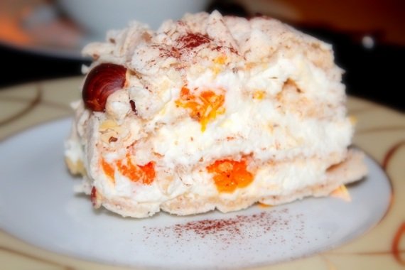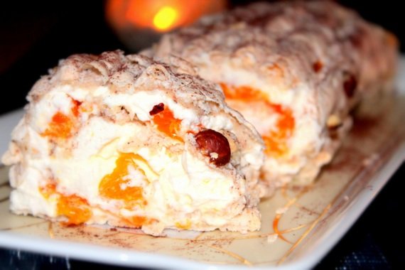 Tradycyjna roladę piecze się z laskowymi orzechami i dodatkiem soku z cytryny. Na nadzienie składa się ubita śmietanka bez cukru, wymieszana z pokrojonymi mandarynkami. Ja używam z puszki, bo uważam za bardzo pracochłonne filetowanie małych mandarynek.