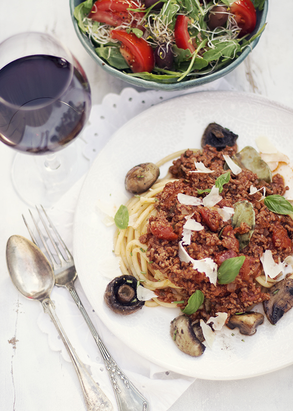Bucatini z ragu z mielonego mięsa i pieczarkami