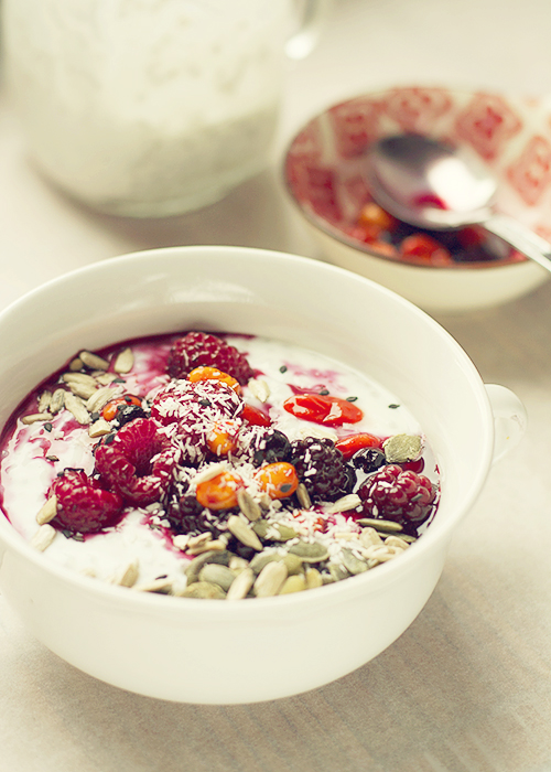 Wymieszaj chia z jogurtem, przykryj i wstaw do lodówki na noc. Przed pójściem spać zamieszaj chiagurt. Na śniadanie dodaj do chiagurtu miód i zamieszaj. Następnie dodaj owoce i uprażone orzechy i nasiona. Całość posyp kokosowymi wiórkami.