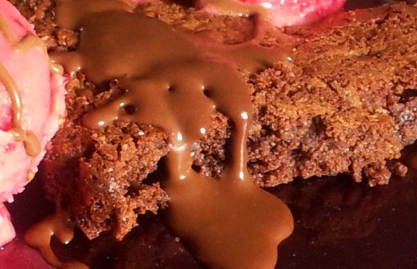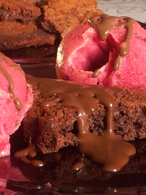 Czekoladowe brownie smakuje najlepiej jak dobrze ostygnie z sosem czekoladowym i malinowym sorbetem. Ciaste jest lepkie, ale takie ma być!