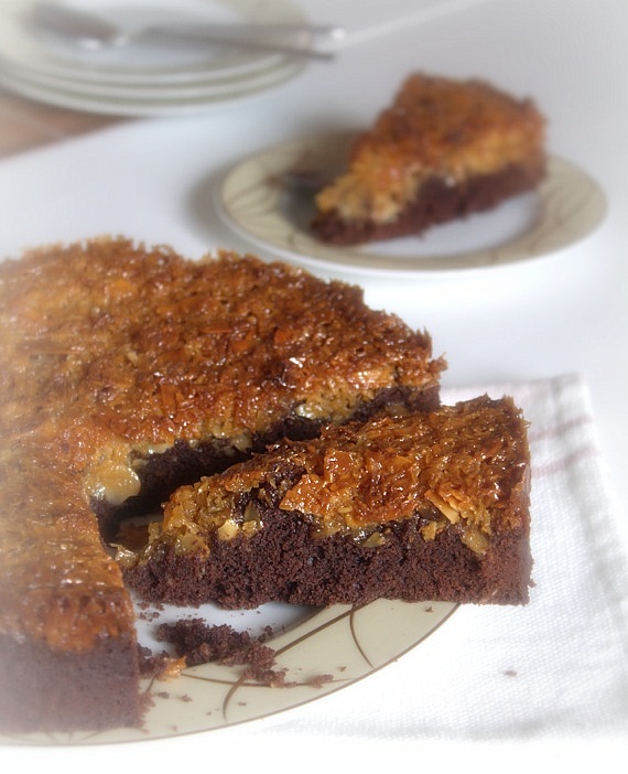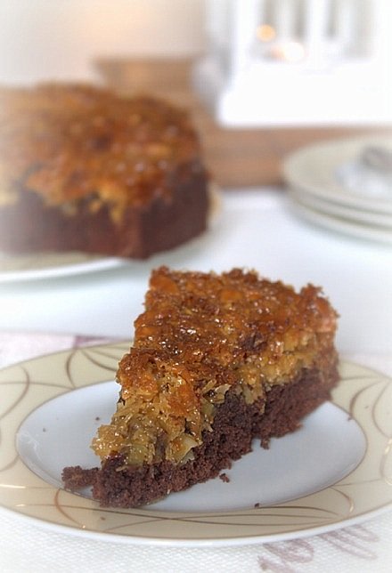 - W rondelku rozpuść masło, cukier, syrop i dodaj śmietankę. Gdy masa zacznie wrzeć wsyp kokosowe wiórki lub migdałowe płatki, lub to i to - pół na pół. Gotową tosca rozprowadź na powierzchni ciasta czekoladowego.