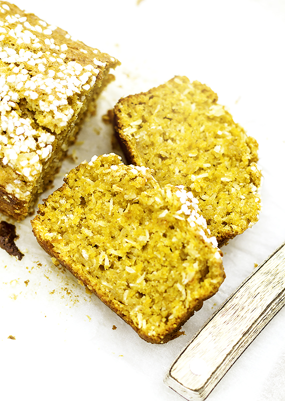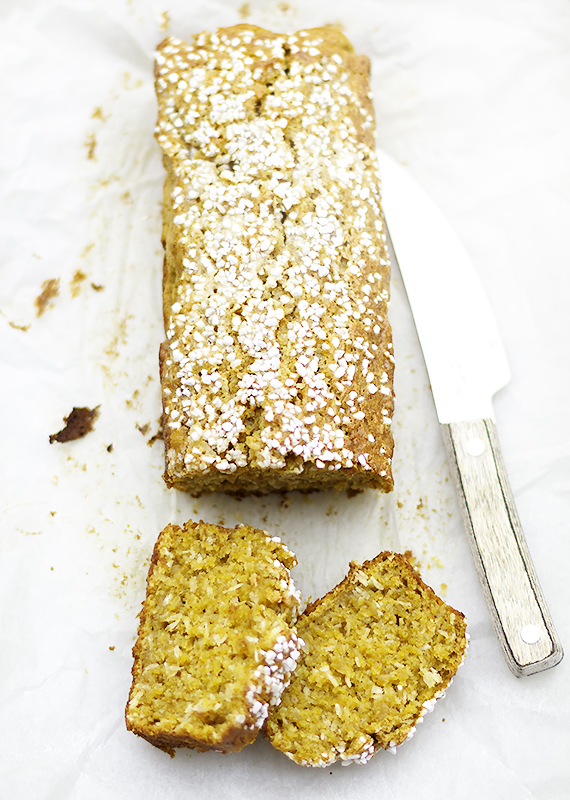 Wszystkie suche składniki na ciasto włącznie z cukrem wymieszaj w misce. W oddzielnej misce połącz jajka z dyniowym puree i kokosowym olejem. Wlej mokre składniki do suchych i dokładnie wymieszaj. Foremkę wyłóż papierem do pieczenia i napełnij masą. Wygładź i posyp perłowym cukrem.