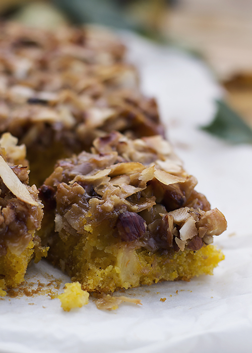 Do dzisiejszego dyniowego ciasta wykorzystałam surową dynię. Dodałam porcję ananasa. Zrobiłam również orzechową kruszonkę tosca.