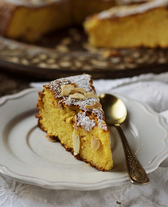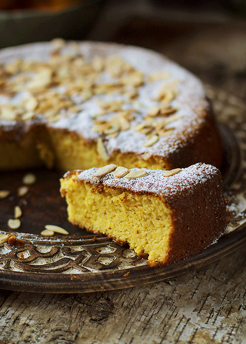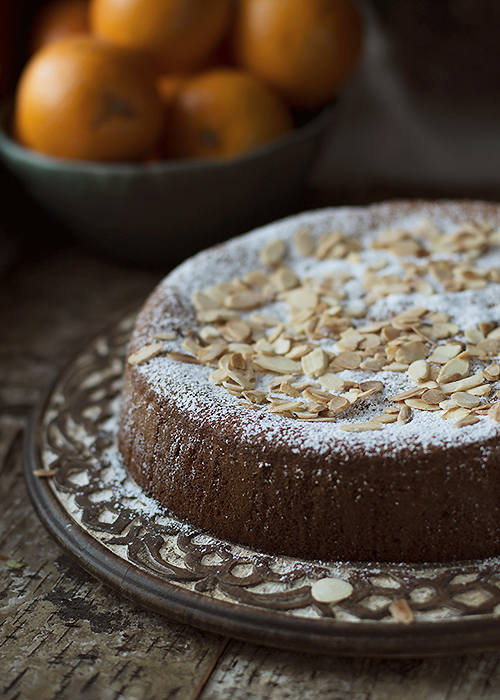Wyszoruj pomarańcze, włóż do rondelka i zalej wodą tak aby pomarańcze były przykryte. Gotuj pomarańcze około 2 godzin. Odcedź i ostudź. Przekrój pomarańcze na pół, pozbaw pestek i zmiksuj. Zachowaj 450 gram, dodaj zmielone migdały, cukier i proszek do pieczenia. Miksuj dodając po jednym jajku.