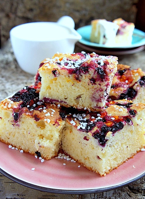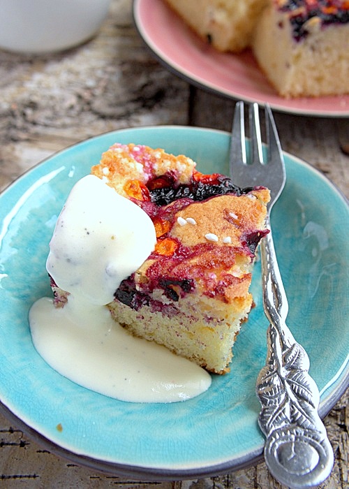 Moje zapasy jagód zaczynają się kurczyć. Tu i ówdzie znalazłam ponapoczynane torebki zamrożonych jagód, resztki żółtych owoców rokitnika, trochę kwaśnej śmietany… Pomyślałam, że będzie ciacho i zaraz dostrzegłam śmietankę…ciacho z sosem waniliowym na zimno, dodałam w myślach.