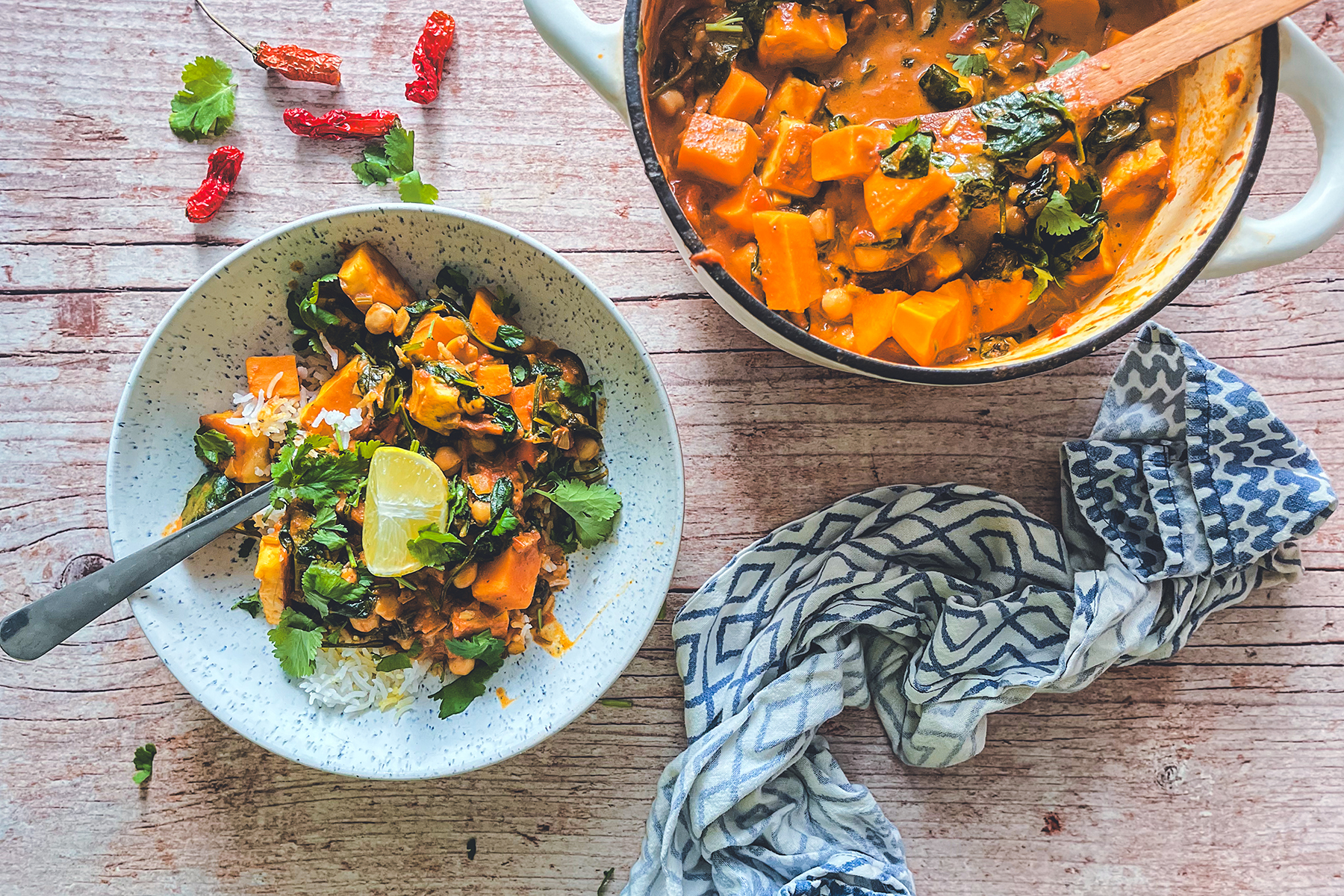 Dodałam do niego również bataty i ciecierzycę. Jest dzięki temu jeszcze bardziej sycące, z większą ilością białka, a słodkie bataty świetnie kontrastują ze słonym serem. Oczywiście nie może zabraknąć świeżej kolendry, a całość najlepiej smakuje podana z ryżem, jak każde dobre curry.