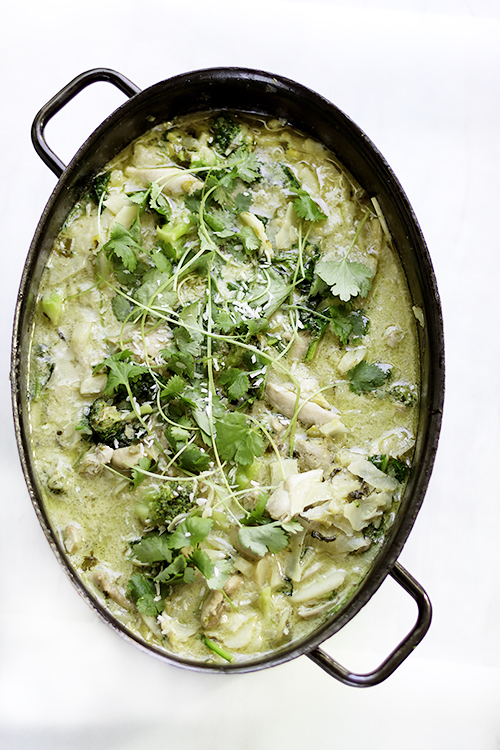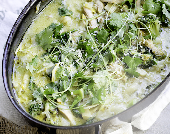 Wlej kokosowe mleko i gotuj curry przez 35 minut. Na 10 minut przez końcem dodaj różyczki brokułu, a na samym końcu gotowania szpinak, tak aby lekko zwiędnął. Dopraw sos soją jeśli jest za mało słony. Posyp kokosowymi wiórkami i resztą kolendry. Podaj curry z kurczaka z ryżem lub makaronem noodle.