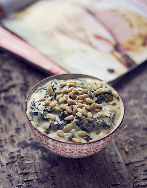 Usuń najgrubsze nerwy z liści kapusty, opłucz i pokrój z grubsza. Obierz cebulę i czosnek, pokrój w drobną kostkę i podsmaż na na łyżce masła. Dodaj kapustę i smaż aż kapusta zwiędnie, około 5 minut. Lekko posól i popieprz. Na drugiej patelni zrumień mąkę, po czym dodaj masło i smaż przez minutę. Dodaj teraz śmietanę cały czas mieszając aby się nie zrobiły kluski. Zalej kapustę zagęszczoną śmietaną, dodaj musztardę i gotuj na małym ogniu przez 15 minut. Po tym czasie kapusta powinna być już miękka. Dopraw solą i pieprzem w razie potrzeby. Podawaj kapustę, posypaną piniowymi orzechami, na gorąco do mięsa czy świątecznej gotowanej szynki.