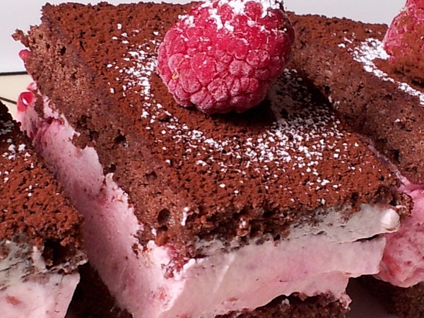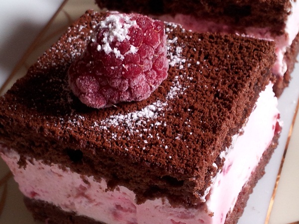 - Posyp ciasto kakaem i podziel na kawałki. Udekoruj malinami i posyp cukrem pudrem.