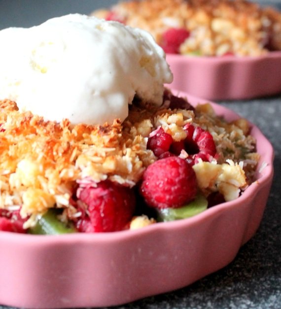 Ta zapiekanka owocowa to świetny deser na sylwestrowe party, zwłaszcza, że mieszankę czekoladowo – kokosową można przygotować o wiele wcześniej i podpiec ją tuż przed podaniem.