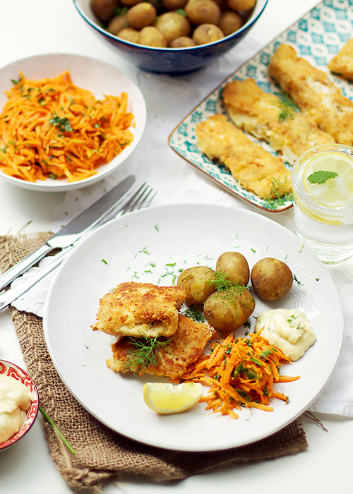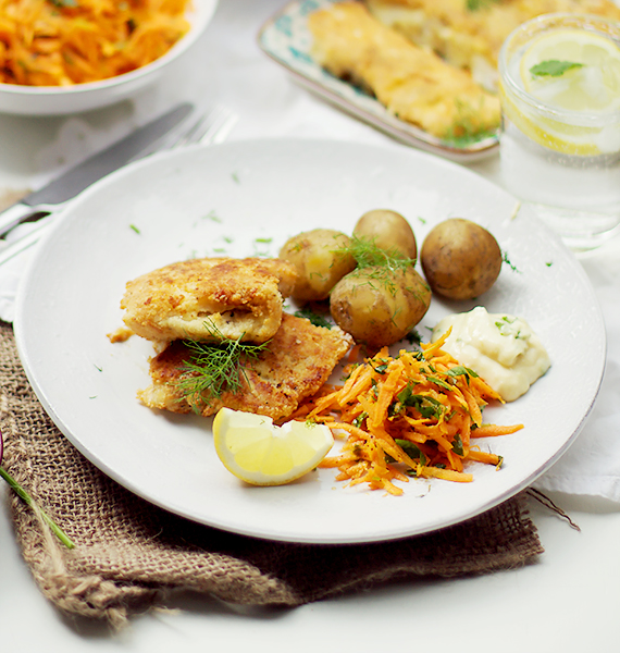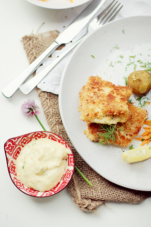 Dzisiaj w Szwecji święto lata. Co prawda lato w tym roku jak na razie nie rozpieszcza ale to nie przyszkadza aby smacznie zaplanować wolny dzień od pracy. Przy piątku postawiłam na rybę dorsz.Bardzo lubię panierowanego, smażonego dorsza. Dzisiaj pozwoliłam sobie zrobić panierkę z migdałowej mąki i parmezanu, a jako przystawkę przygotowałam prostą surówkę z marchewki i pietruszki. Do ryby przyrządziłam również sos aioli. Młode ziemniaczki „w mundurkach” posypane świeżutkim koprem…oj tak, typowy letni obiad.