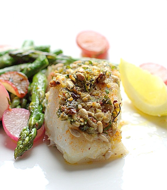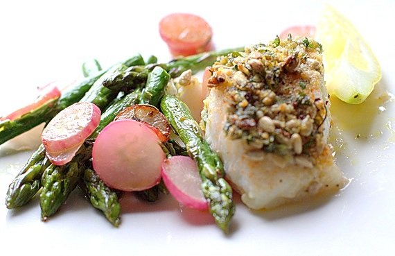 Dorsz zapiekany ze szparagami i rzodkiewkami