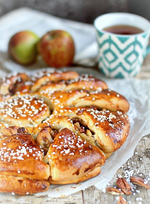 Dawno nie piekłam drożdżowego ciasta. Najbardziej lubię piec drożdżowe z owocami. Dzisiaj proponuje przepis na drożdżowy wieniec z jabłkami i orzechami. Bardzo proste ciasto drożdżowe, które upiekłam z jabłkami i orzechami pekan. Idealne do popołudniowej kawy. Nie za słodkie, więc i na śniadanie w sam raz. Ciasto drożdżowe do odrywania w kształcie wieńca zamiast tradycyjnego drożdżowego w prostokącie, tak lubię!