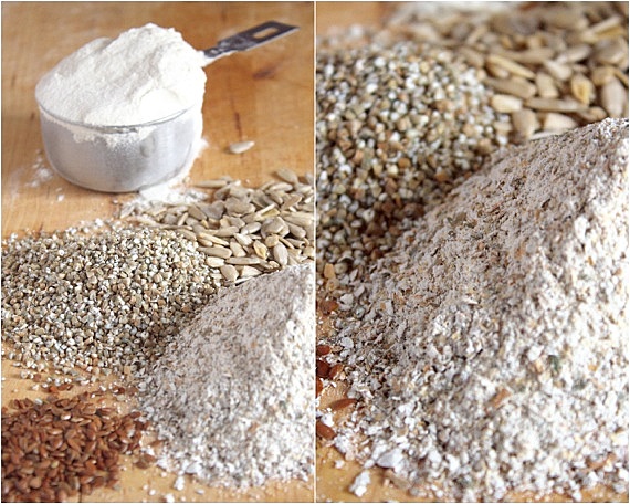 Do wypieku tego żytniego chleba użyłam mąki żytniej z otrębami jak na zdjęciu poniżej. Poza tym połamane ziarna żyta, nasiona słonecznika i siemienia lnianego.