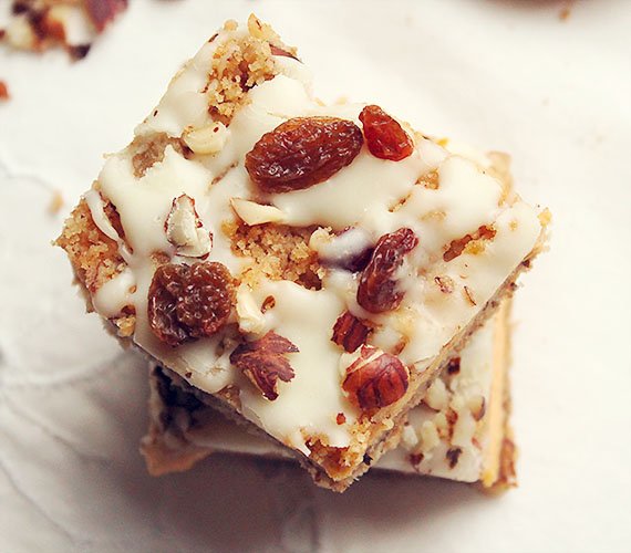 W miedzyczasie rozpuść białą czekoladę w kąpieli wodnej. Dodaj śmietankę, aby polewa była aksamitna po zastygnięciu. Rozprowadź polewę po serniku i natychmiast posyp orzechami i rodzynkami.