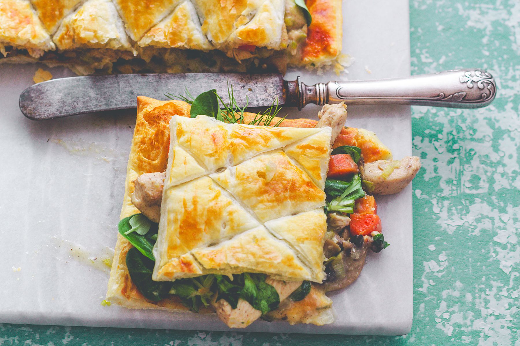 - Wyjąć z piekarnika upieczone ciasto francuskie. Delikatnie naciąć nożem ramkę i oderwać "przykrywkę"od reszty ciasta. Na reszcie ciasta ułożyć sałatę, a następnie rozprowadzić nadzienie z kurczaka i przykryć oderwaną częścią ciasta. Pokroić na kawałki podawać od razu. smacznego!