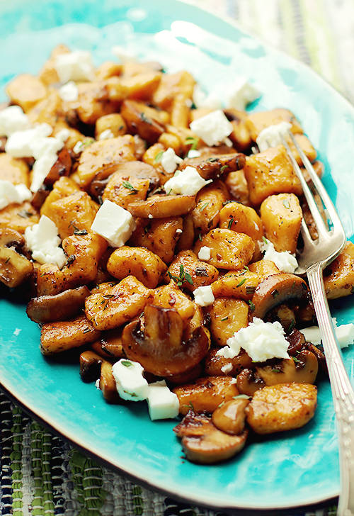 Bardzo lubię gnocchi w ogóle wszelkiego rodzaju kluski i kopytka. Gnocchi pasują do mięsnych potrawek czy sosów zamiast tradycyjnych ziemniaków. Tradycyjne gnocchi z ziemniaków podałam kiedyś do francuskiej potrawki Boeuf Bourgignon. Dzisiaj jednak postanowiłam obyć się bez mięsa i przyrządzić pieczarki karmelizowane w balsamicznym occie, które świetnie harmonizują z batatowymi gnocchi o lekko słodkim smaku. Całość posypałam pokruszoną owczą feta. Miał być kozi ser ale akurat mi się skończył. I tak było pysznie!