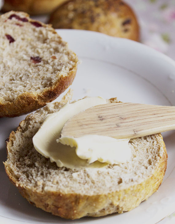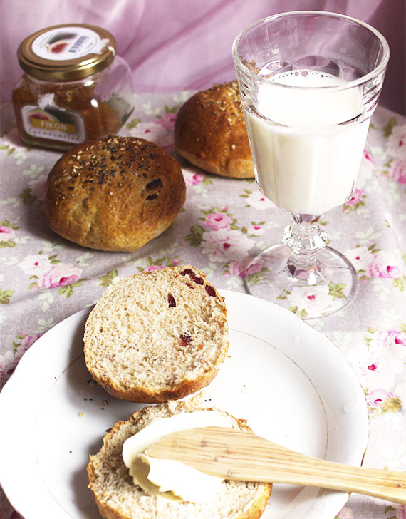 Wczoraj upiekłam bułeczki grahamki. Zalazłam w lodówce paczkę twarożku i nie zastanawiając się długo dodałam do zaczynu. Miałam też resztkę suszonej żurawiny, która również powędrowała do ciasta.