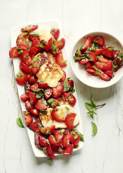 Uwielbiam halloumi! Taki niepozorny serek, który nabiera smaku i blasku po usmażeniu czy jak dzisiaj po ugrillowaniu. Jako dodatek do halloumi, dosyć słonego sera proponuję truskawki, świeżą kolendrę i miętę. Wspaniała przekąska do lampki wina…moja dzisiejsza kolacja. Trochę luksusu nie zaszkodzi! W końcu są wakacje!