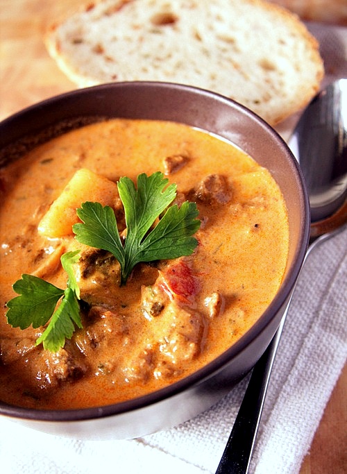 Dzisiaj zapraszam na pyszny gulasz biff Stroganoff w nowej odsłonie. Bardzo lubię gotować mięsny gulasz, bo mięso i warzywa gotuję razem w jednym garnku. Dzisiaj dodałam jeszcze ziemniaki, więc do tak pysznego gulaszu jak dla mnie wystarczyła jedynie kromka świeżo upieczonego chleba. Gulasz biff Stroganoff można ugotować na różne sposoby. Wcześniejszą wersję tego wspaniałego mięsnego gulaszu ugotowałam z leśnymi grzybami. Jestem ciekawa co wymyślę następnym razem, może biff Hagganoff (od mojego nazwiska Haggu)…ha, ha!