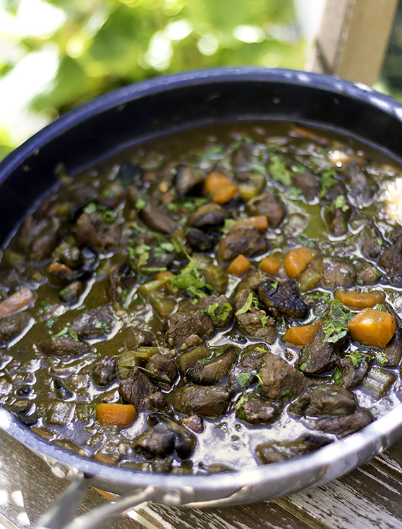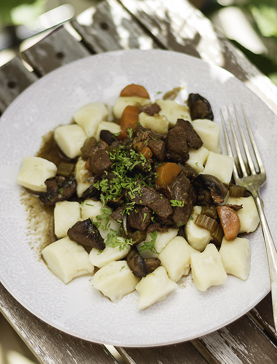 Gulasz mięsny z dzika….Rzadko kiedy przyrządzam dziczyznę ale jak już wpadnie mi w ręce kawałek dziczyzny to robię to z pompą. Gulasz mięsny z dzika jest tego przykładem. Użyłam tutaj szynki z dzika. Piękne mięso o ciemnym kolorze, przypominające wołowinę. Wpadłam więc na pomysł przyrządzić gulasz z dzika podobnie jak francuski gulasz Boeuf bourguignon. Gulasz jest bardzo aromatyczny i w odróżnieniu od gulaszu z wołowiny jest gotowy już po godzinie. Podałam gulasz z kopytkami. Nie wiem jak Wy ale moja rodzinka lubi gulasz mięsny z kopytkami lub innymi kluskami.