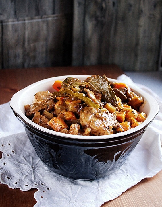Dzisiaj zrobiłam przegląd w lodówce. Czas na świąteczne porządki, więc muszę ją powoli opróżniać. Znalazłam wieprzowe polędwiczki, resztki marchewki, selera i pietruszki, jeden batat…W szafce wyszperałam napoczętą paczuszkę suszonych śliwek i napoczętą butelkę sherry. Stwierdziłam, że tyle dobroci na raz najlepiej wrzucić do jednego garnka. Zdecydowałam się na gulasz i choć gulasz mięsny to danie jednogarnkowe ja wolałam trochę pokombinować.