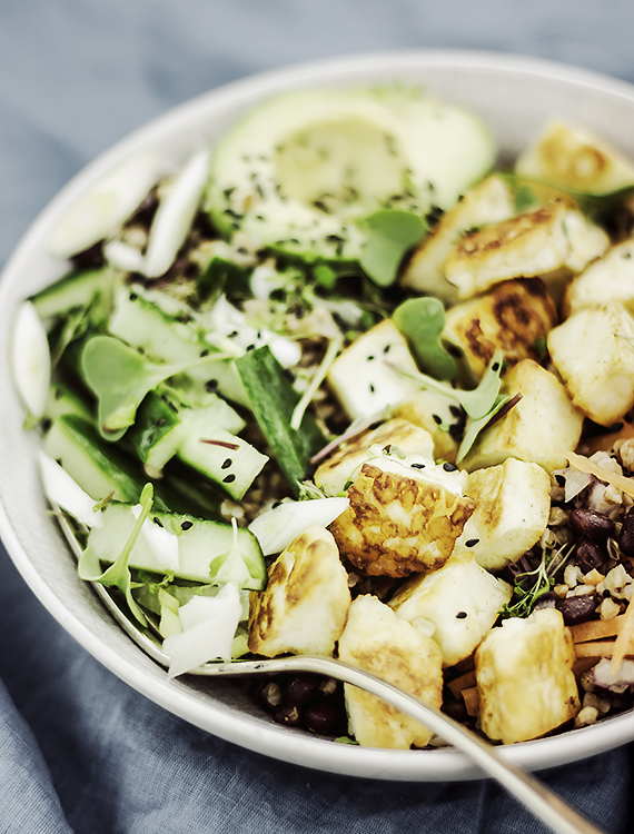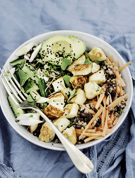 Ugotuj fasolę ming i kaszę w oddzielnych garnuszkach. Fasola ming nie potrzebuje namaczania. Odcedź fasolę, odparuj kaszę i wymieszaj z dressingiem z oliwy, cytryny, czosnku, cebulki i miodu. Przekrój awokado na pół i połóż na sałatce razem z pokrojoną marchewką i ogórkiem. Pokrój halloumi w kostkę i usmaż na oleju na złoty kolor. Ułóż halloumi na talerzu. Całość posyp zarodkami i czarnym sezamem.