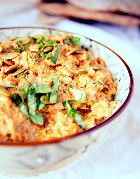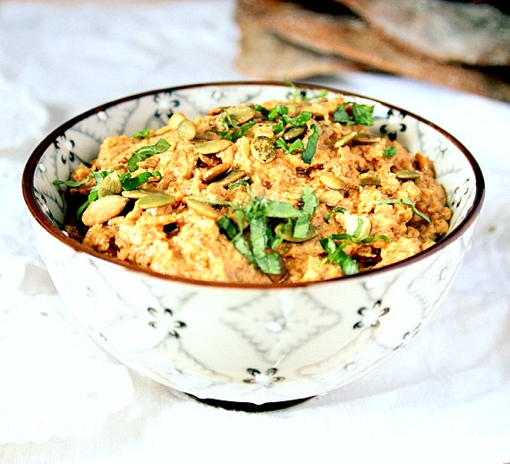 Ten hummus to nie tradycyjny hummus z ciecierzycy. Użyłam tutaj białą fasolę cannellini jak również zrumienione pestki dynii i pieczoną, czerwoną paprykę. Polecam bardzo!