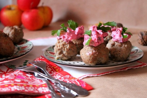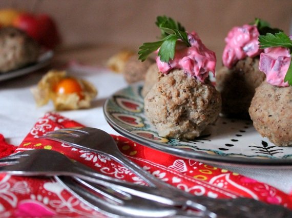 Nieodzowna salatka do szwedzkich klopsikow jest salatka z buraczkow i majonezu. Do mojej salatki dodaje posiekany ananas, a i doprawiam troche lepiej niz Szwedzi. Tak udekorowane köttbullar to rowniez swietna zimna przekaska.