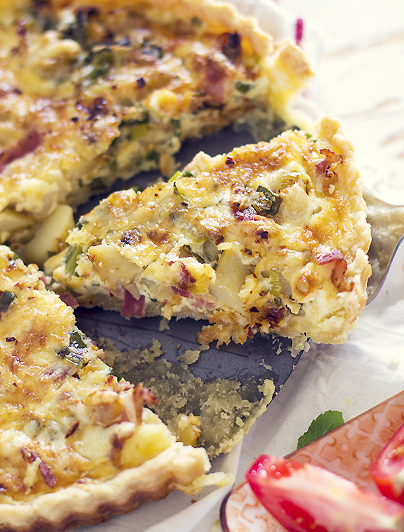 Moje ziemniaczane resztki wykorzystałam do quiche. Przygotowałam je z dodatkiem boczku, czosnku i pora. Quiche to nic innego jak wytrawna tarta, która zawiera jakiś rodzaj mięsa czy warzywa, zrobiona z kruchego ciasta i zalana masą jajeczno śmietanową. Danie wywodzące się z Francji, gdzie najbardziej znane quiche Lorraine już prezentowałam na blogu. Quiche z boczkiem i szpinakiem to kolejna ulubiona tarta na wytrawnie.