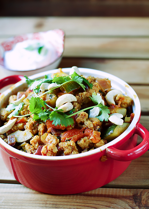 Gotuj soję w bulionie przez około 8 minut, po czym odcedź. Zachowaj bulion. Pokrój cebulę i cukinię w dużą kostkę, a czosnek i imbir w drobną kostkę. Wrzuć nasiona przypraw na rozgrzaną, suchą patelnię i zrumień, a następnie zgnieć w moździerzu. Podsmaż warzywa na oliwie z dodatkiem przypraw. Dodaj pomidory pokrojone w kostkę i część posiekanej kolendry. Gotuj sos przez 20 minut po czym dodaj soję i doprowadź sos do wrzenia. Podaj sos do ryżu posypany orzechami cashew i kolendrą. Jako dodatek polecam jogurt z dodatkiem soku z limonki, łyżki miodu i kolendry.