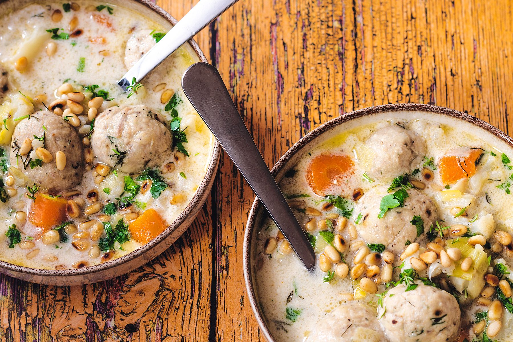 - Zupę rozlać do miseczek, posypać prażonymi piniami i posiekaną natką pietruszki. Smacznego!