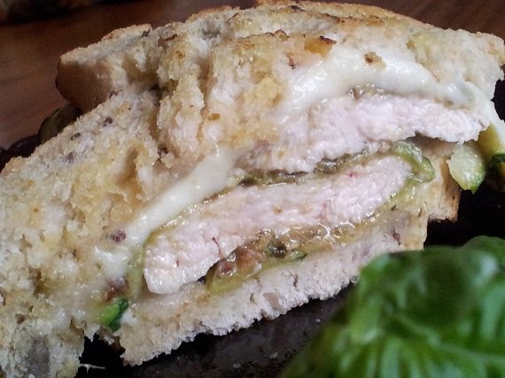 Moje dzieci z chęcią jedzą kanapki z obiadowych resztek ! Dzisiaj znowu takie zrobiłam. Zostały mi resztki kurczaka w pesto. Poza tym miałam trochę mozzarelli i bochenek pysznego chleba, z domowego wypieku.