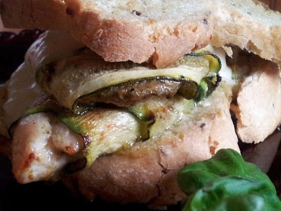Kawałki kurczaka wraz z mozzarellą, umieściłam między dwoma kromkami chleba. Każdą kromkę posmarowałam oliwką, aby kanapki dobrze się przyrumieniły podczas zapiekania. Tak przygotowane jadło wrzuciłam do piekarnika na kilka minut.