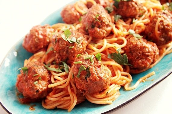 - Ugotuj spaghetti al dente w lekko osolonej wodzie. Odcedź ale zaoszczędź 100 ml wody, w której było gotowane spaghetti. Wlej wodę do sosu, wymieszaj i dodaj klopsiki, a następnie wymieszaj wszystko ze spaghetti. Posyp natką pietruszki.