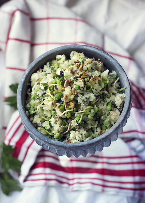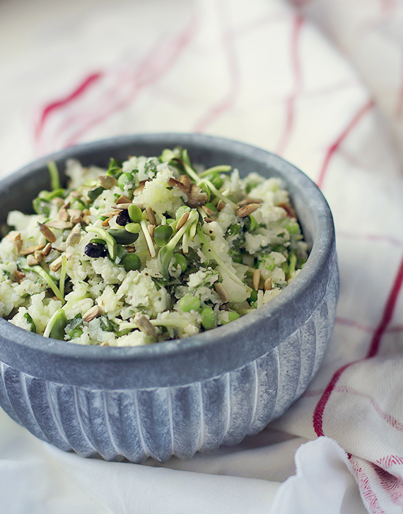 Trudno było mi się przekonać do kalafiora jako dziecko ale za to teraz uwielbiam to warzywo. Kalafior jest wspaniały i naprawdę można go przyrządzić na mnóstwo sposobów. Zapomnijcie o gotowanym kalafiorze, który pachnie jak spocone skarpetki. Dzisiaj polecam kolorową sałatkę z kalafiora w towarzystwie zielonego groszku, sera feta i pestek słonecznika z mnóstwem świeżych ziół. Sałatka pasuje jako samodzielne jarskie danie lub jako dodatek do dania głównego.