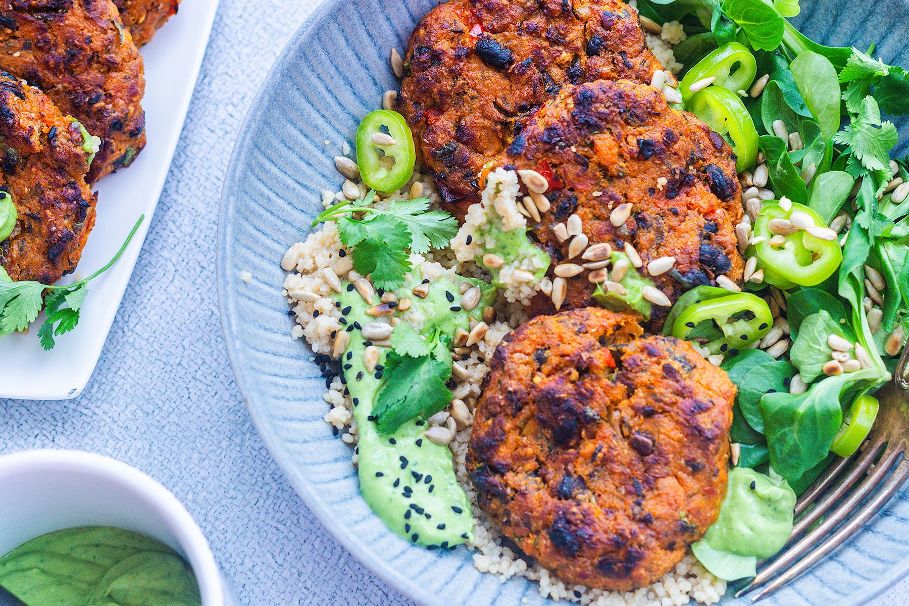 - Kotlety z batatów podawać z kaszą couscous, sałatą, papryką i dressingiem. Na koniec posypać danie nasionami. Smacznego!