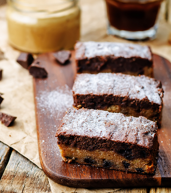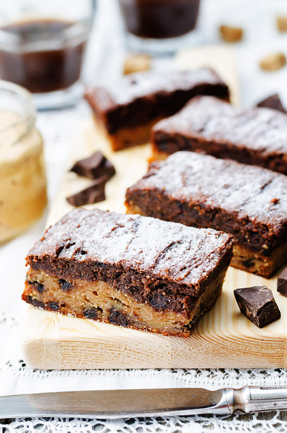 Nastaw piekarnik na 160ºC na termoobieg (bez termoobiegu 10 stopni więcej lub wedle piekarnika). Foremkę wyłóż papierem do pieczenia. W miseczce zmiksuj masło z masłem orzechowym, jajkami, cukrem (białym i brązowym) oraz wanilią. Przesiej mąkę z proszkiem i dodaj do masy. Wymieszaj. Oddziel jedną trzecią masy. Do większej części dodaj grubo pokrojoną czekoladę (2 łyżki odłóż do masy kakaowej) i wymieszaj. Wyłóż masę do foremki. Do reszty dodaj kakao, czekoladę i wymieszaj. Wyłóż masę na jasną masę i wygładź powierzchnię. Wstaw ciasto do nagrzanego piekarnika i piecz 25-30 minut. Lepiej aby ciasto było lekko niedopieczone niż przypieczone. Sprawdź za pomocą patyczka. Jeśli patyczek jest lekko obklejony okruszkami to ciasto już jest gotowe. Ostudzoną krajankę oprósz cukrem pudrem pokrój na kawałki.