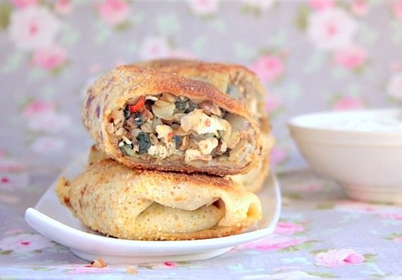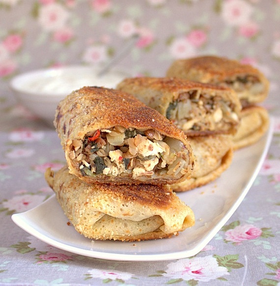 - Usmaż 12 naleśników. Na środku ułóż porcje nadzienia, zwiń brzegi do środka i zawiń raz.