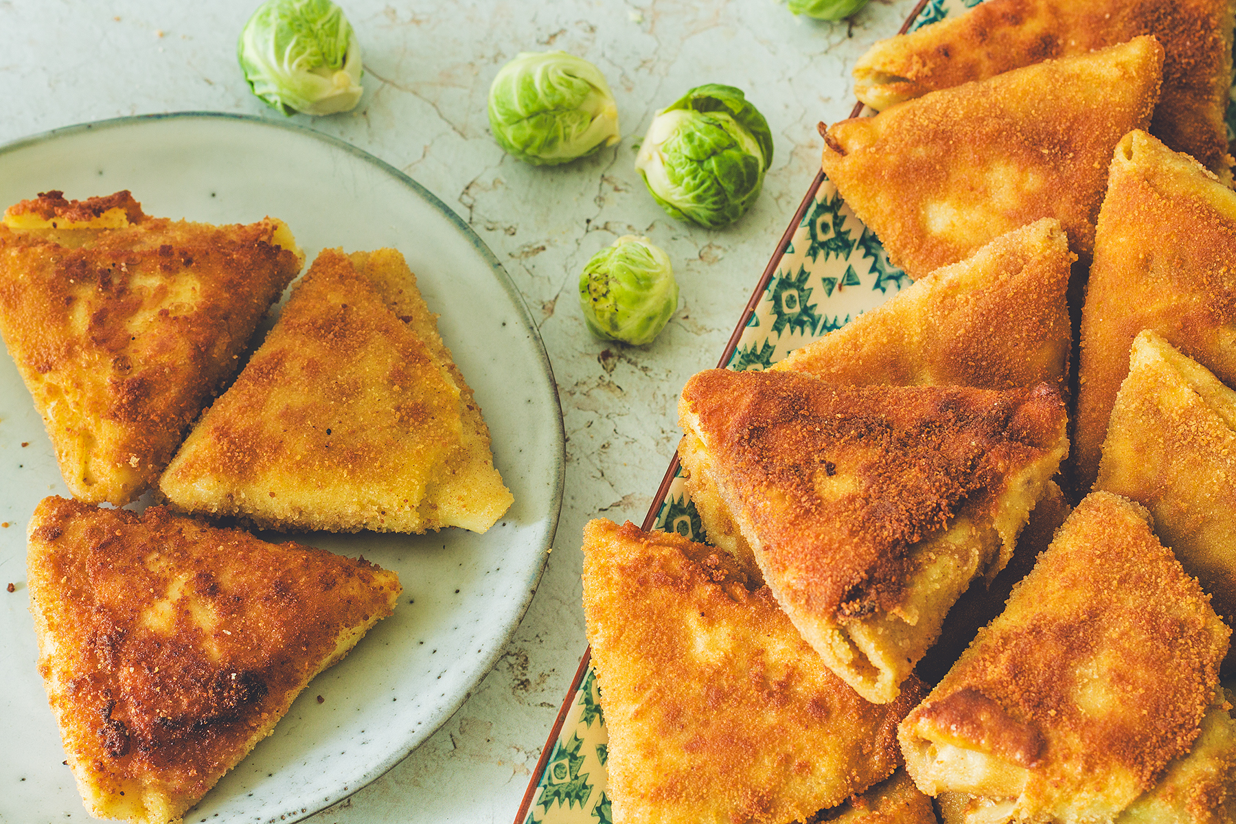 Tym razem postawiłam na krokiety w kształcie trójkątów. Zakochałam się w tym sposobie od pierwszego zawinięcia i dlatego pokazałam go w rolce na Instagramie. Takie krokiety są poręczne, można je zjeść rękami albo maczać w dipie. Idealne na szybki obiad lub przekąskę.