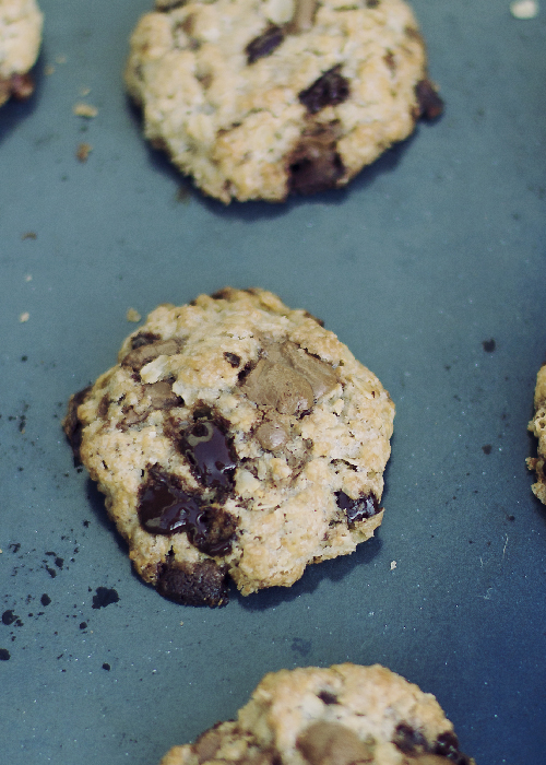 Przygotuj dwie miski. Do jednej wsyp suche składniki wraz z czekoladą i wymieszaj. W drugiej misce wymieszaj jajko z olejem. Połącz teraz mokre składniki i suchymi. Formuj z ciasta kulki i układaj na blasze wyłożonej pergaminem w odstępach. Piecz ciastka w nagrzanym piekarniku na 180ºC na termoobiegu (bez termoobiegu 10-15 stopni więcej) przez 12 minut. Wyjmij z piekarnika. Ciastka będą wciąż miękkie, ale jak ostygną będą kruche.