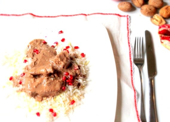 Podziel mięso na mniejsze kawałki. Zmiksuj orzechy. Pokrój cebulę w kostkę. Podsmaż mięso na rozgrzanej patelni wraz z cebulą i przyprawami. Przełóż do garnka o grubym dnie. Dodaj przecier z granatu, orzechy i wlej wrzątek. Gotuj gulasz przez około 40 minut. Na 5 minut przed końcem gotowania dodaj rodzynki. To danie jak większość potraw perskich podaję z ryżem ugotowanym na sypko z dodatkiem szafranu.