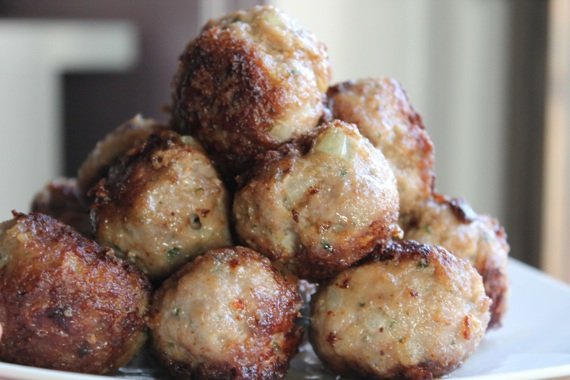 Z podanych produktow zrob puszysty farsz. Krec kulki wielkosci orzecha wloskiego, a wlasciwie troche wieksze, bo sie zmniejsza podczas smazenia. Obtocz kazda kulke w mace ziemniaczanej i smaz na masle i oleju, ruszajac patelnia od czasu do czasu, aby sie rownomiernie zrumienily.
