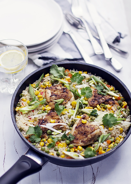 Kurczak potraktuj przyprawami i odstaw na godzinę. Podsmaż kurczaka na oleju kładąc go skórką do dołu. Patelnia powinna być dobrze rozgrzana. Kiedy skórka się zrumieni odwróć porcje kurczaka na drugą stronę i smaż przez minutę. Wyjmij kurczak. Na tą samą patelnię (użyłam głębokiej) wrzuć posiekany czosnek, pokrojoną w kostkę cebulę,chili i imbir. Smaż przez minutę, po czym dodaj marchewkę i smaż jeszcze przez następną minutę. Opłucz ryż i dodaj do warzyw. Smaż aż ryż się zeszkli. Dodaj teraz groszek i kukurydzę, a całość podlej bulionem. Gotuj na dosyć szybkim ogniu, a kiedy bulion wyparuje do połowy, przykręć kuchenkę (w indukcyjnej 3 poziom), ułóż porcje kurczaka na ryżu i przykryj przykrywką. Gotuj danie jeszcze przez 15 minut. Gotowe danie posyp kolendrą i piórkami dymki.