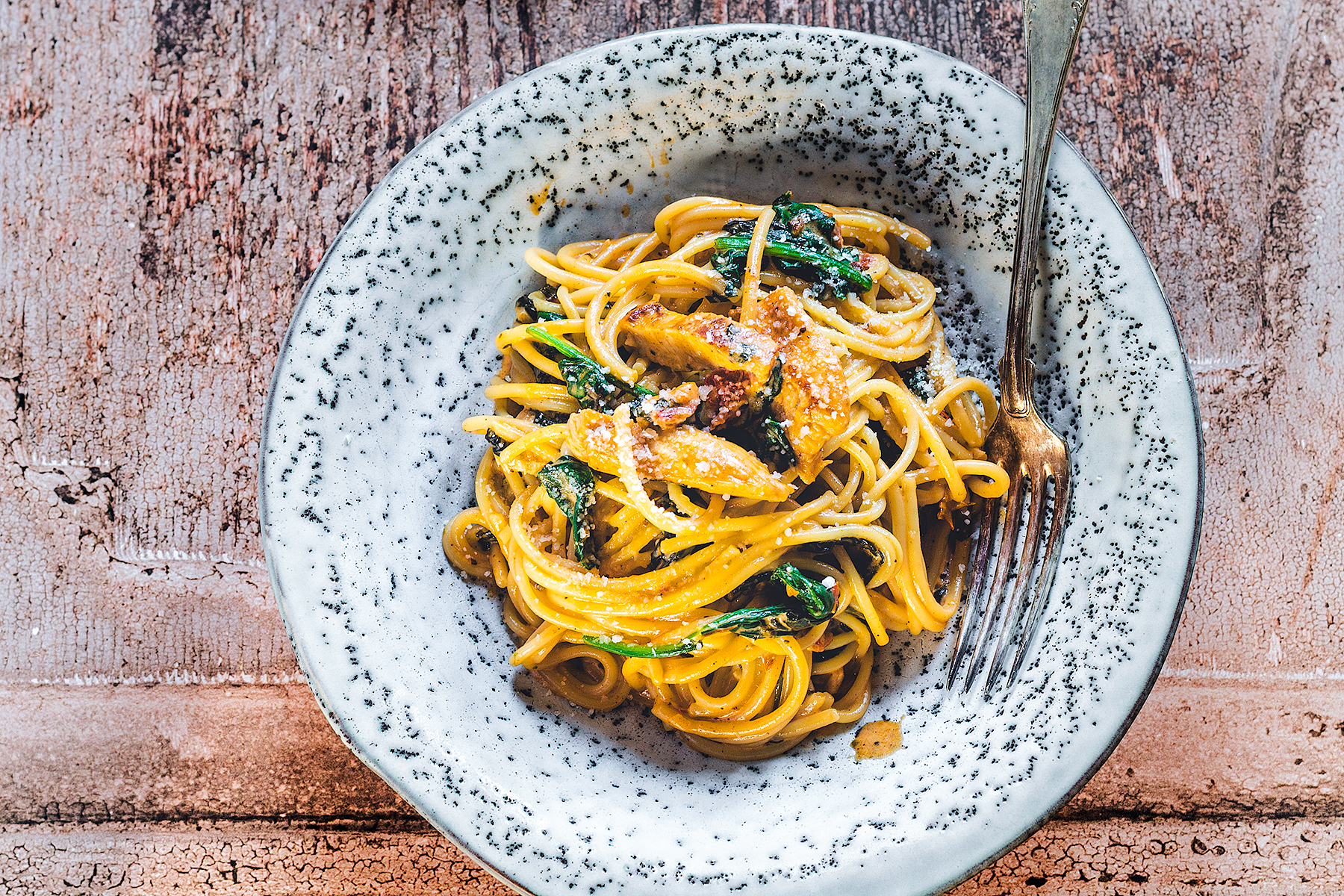 - Dodać szpinak i mieszać, aż lekko zwiędnie. Szczypcami przełożyć makaron prosto z garnka na patelnię i wymieszać, aby pokrył się sosem. Dodać pokrojonego kurczaka wraz z sokiem, ktory puścił i dalej mieszać makaron, aż sos stanie się kremowy. Powinien lekko zgęstnieć i oblepić makaron. Jeśli sos zrobi się zbyt gęsty, dolać odrobinę wody z gotowania makaronu.